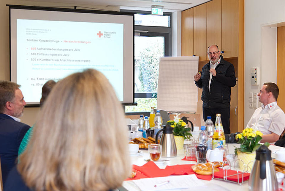 Im Fokus des Austauschs standen die Herausforderungen, vor denen die Pflegeheimbetreiber vornehmlich in der solitären Kurzzeitpflege aktuell stehen. Zwar sei speziell die Kurzzeitpflege ein angesehenes Projekt, welches einen dringend benötigten Bedarf abdeckt, jedoch ist der pflegerische und administrative Aufwand um ein Vielfaches höher im Vergleich zur stationären Dauerpflege. Dies begründe unter anderem, warum es nur wenige reine Kurzzeitpflegeeinrichtungen im Land gäbe. Im 24-Bettenhaus des DRK-Pflegezentrums habe man im Jahr rund 500 Aufnahmen und Entlassungen zu bewältigen bei einem exorbitant höheren Dokumentationsaufwand gegenüber der Dauerpflege im Verhältnis zur Verweildauer.